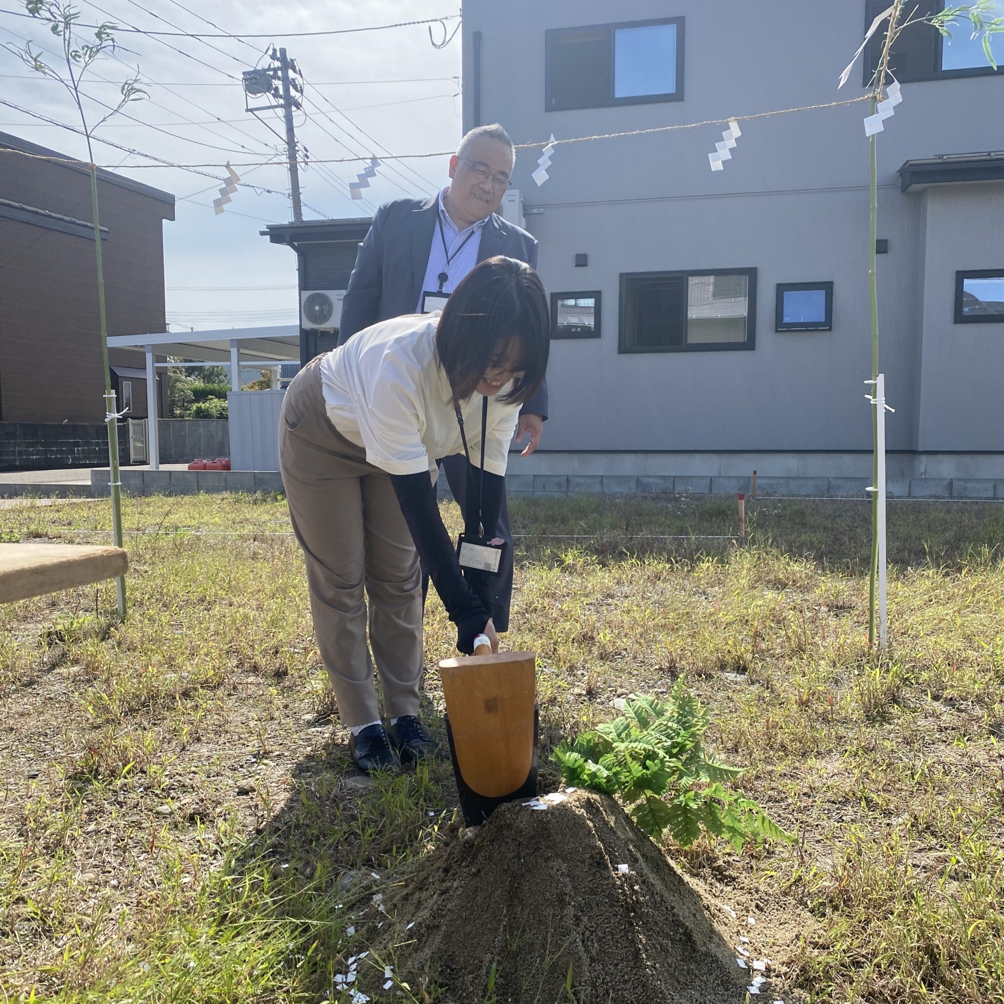モデルハウスの地鎮祭は今回が初めてで、いつも見ていた鍬入れの儀を体験することができました😊