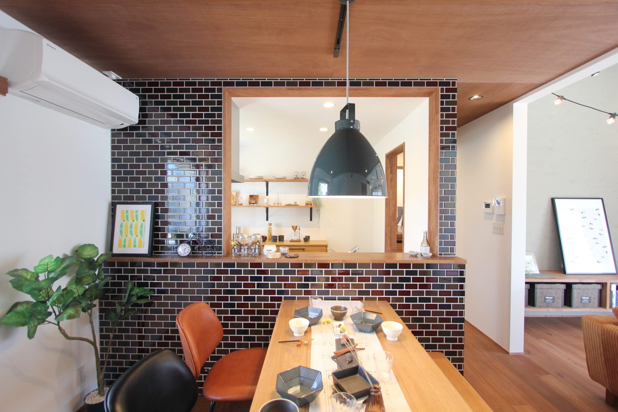 アンティークなタイルと木枠で仕上げた対面キッチン。目地の色にもこだわったレトロな雰囲気はまるでおしゃれなお店のよう。