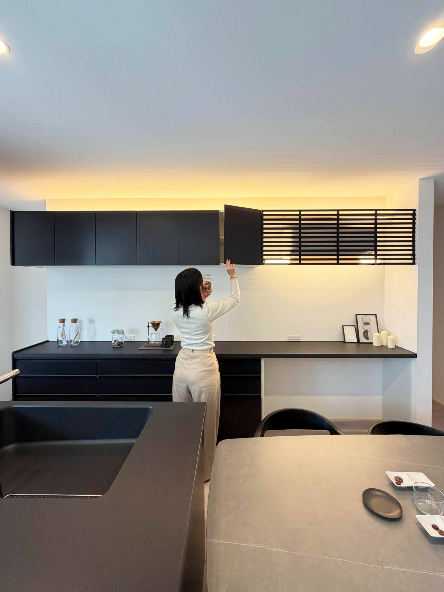 ブラックでまとめたキッチンに、やわらかな間接照明。静かな空気が似合う、心地よいダイニングキッチンです。
