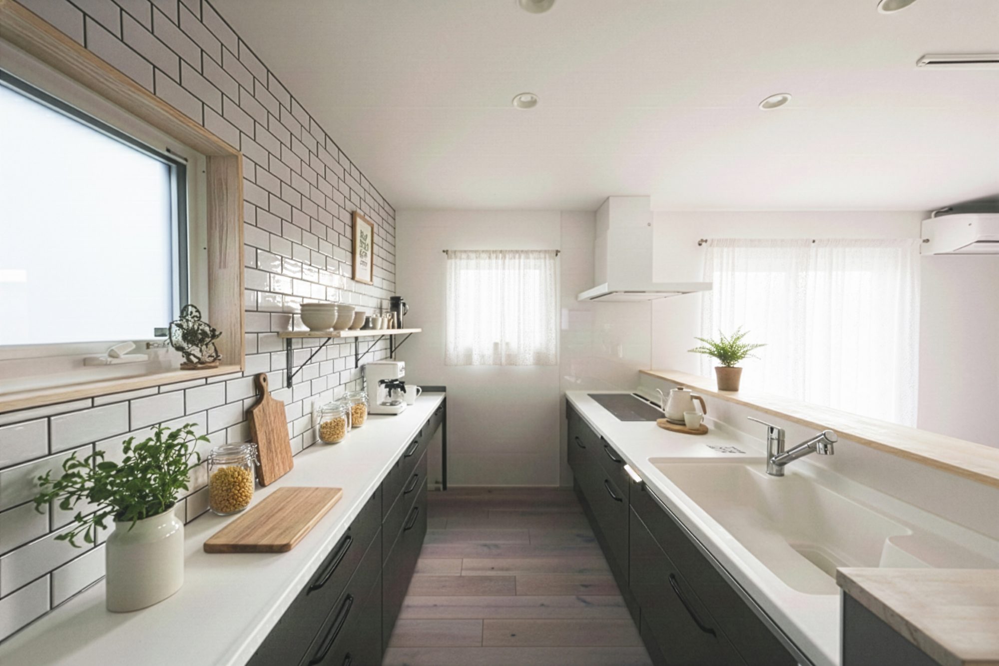 光が入るだけで、キッチンは「作業場」から「風景」になる。白いタイルに、木のやさしさ。並ぶ器や道具は、使われるのを待ちながら、静かに暮らしに寄り添います。