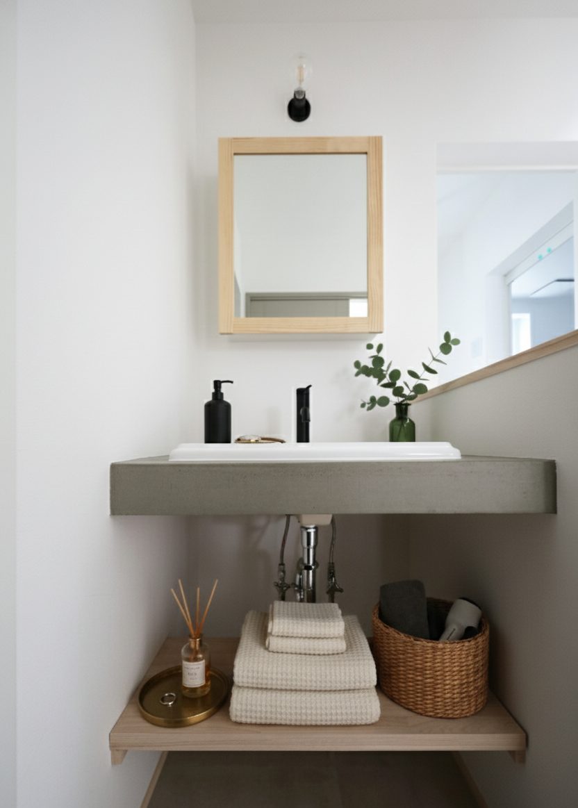 朝、顔を洗うだけの場所なのに。光と白、木のやさしさに包まれると、気持ちまで整っていく。飾りすぎず、削ぎ落としすぎず。必要なものだけが、ちょうどいい距離で並ぶ洗面台です。