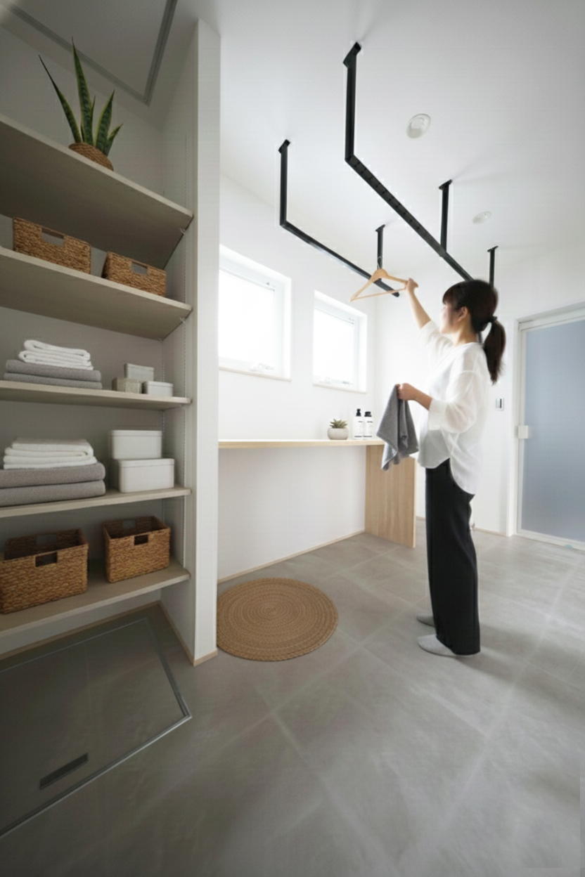 光の入るランドリースペースは、家事をこなすための部屋ではなく、暮らしの流れを受け止める場所。天井から伸びる物干しも、並んだ収納棚も、毎日を少しだけ軽くするための設えです。